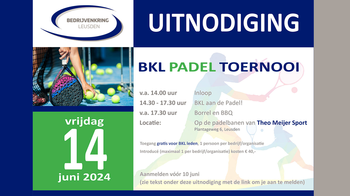 Op vrijdag 14 juni organiseren we ons jaarlijkse BKL sportevenement. We gaan weer de padelbaan op! We spelen dit keer op de padelbanen van Theo Meijer Sport in Leusden. Zij beschikken over zowel buiten- als binnenbanen, dus ook ingeval van slecht weer kan ons toernooi gewoon doorgaan. We hebben ervoor gezorgd dat iedereen aan zijn/haar trekken komt, of je nou beginner, een gevorderde of ervaren speler bent. Er wordt gespeeld in groepjes van vier per baan.